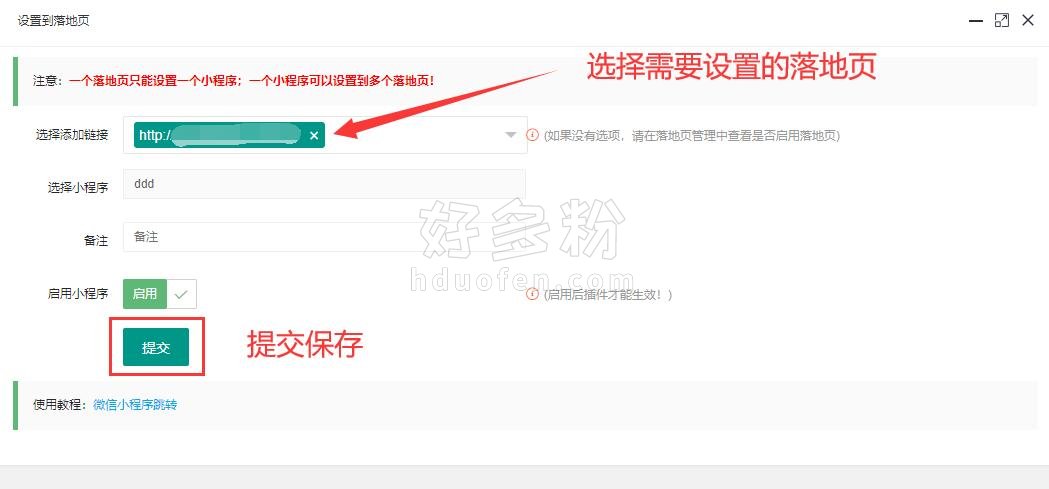 3.1.如果您的落地页已在好多粉绑定使用,并且开启了点击复制弹窗 (弹窗1,2,3,8,11)或者插件(插件2,5,16,17,20),只要弹窗或插件中带有打开微信按钮,只需点击关联落地页即可跳转微信小程序