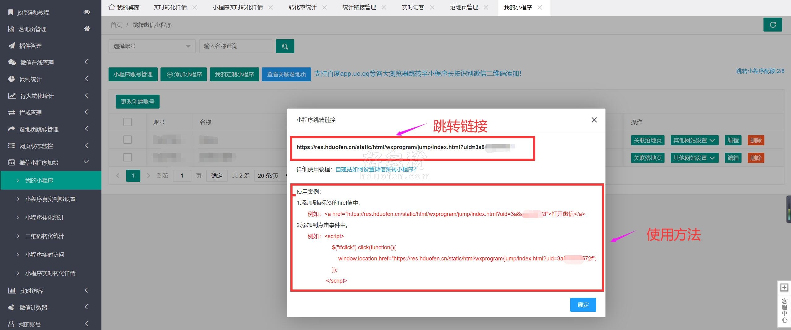 3.3.如果您的落地页使用的是自己弹窗,或者打开微信等,也就是没有使用好多粉的点击复制弹窗(弹窗1,2,3,8,11)或插件(插件2,5,16,17,20),需要自行复制小程序链接设置到打开微信跳转的链接上才可触发跳转微信小程序
