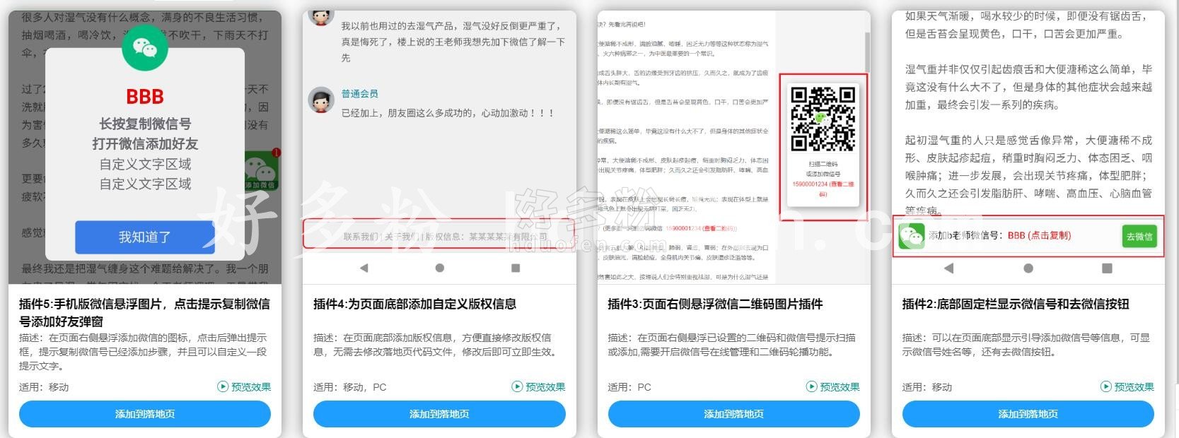 PC:页面底部是写上微信号,再设置复制按钮,直接可复制。页面中或者页面右边可以选一块固定区域设置浮悬二维码,便于访客直接拿手机扫码并且好多粉工具也可以回传各大平台oCPC数据(例如:百度/头条/阿里汇川/神马卧龙/搜狗/360/知乎oCPC好多粉均已支持)