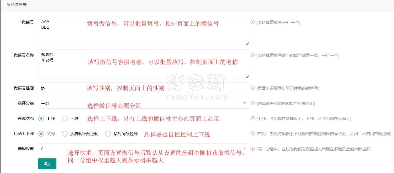 5、设置落地页微信号管理:新增分组微信号按最小复制数显示,实现均衡加粉的目的。