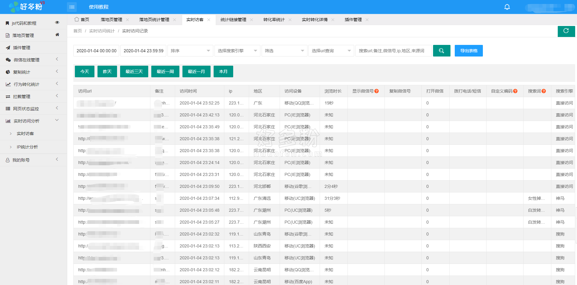 很多时候我们统计加粉词其实就是统计客户的复制行为,这个复制行为其实只需要通过添加一个基础的JS代码到网页头部就可实现:统计落地页复制次数;统计复制来源搜索词;统计复制来源地区;统计复制来搜索引擎;统计复制来源关键词,方便区分来源关键词和创意;统计微信号复制次数;实时查看复制访客记录;支持单页面多个微信号统计。